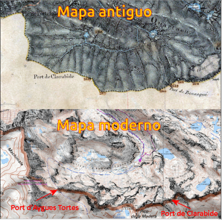 En este enlace se puede ver la historia de este tema en inglés, junto con unas imagenes de un mapa antiguo y uno moderno, en el que se vé que el actual Puerto de Aygues Tortes, antes se conocía por Puerto de Clarabide.