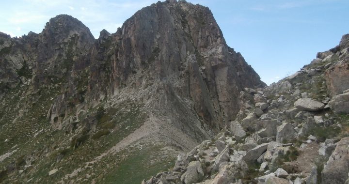 Vamos acercandonos al Pic del Aliga y aunque en la foto no se aprecia, entre las rocas de color claro y las de color oscuro que se ven detrás, no hay camino, y no se puede continuar adelante.