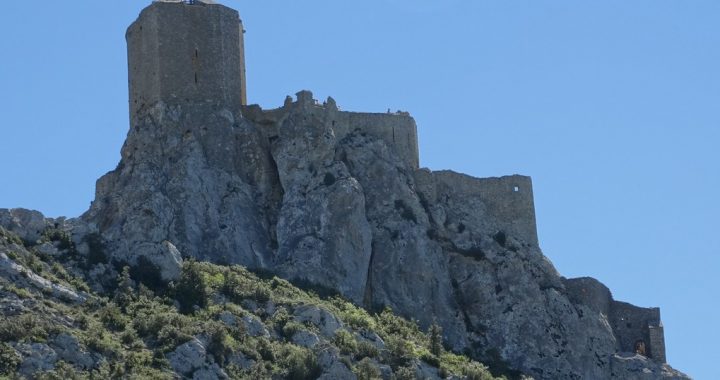 El castillo de Queribus está situado entre los pueblos de Cucugnan y Duilhac-sous-Peyrepetuse, (en la región de Languedoc-Rosellón y región natural de las Corbières) , y está muy cerca del castillo de Peyrepertuse, que visitamos hace 2 años. ( Ver 03-04-2015 – Castillo de Peyrepertuse )