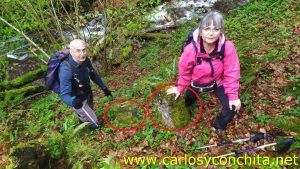 Con la ayuda de nuestro amigo Eef, hoy hemos conseguido llegar a esta difícil borna, situada cerca de un torrente, abajo en un barranco, y con una fuerte pendiente que además hoy estaba muy resbaladiza por la lluvia de esta pasada noche, y para acabarlo de arreglar con mucha niebla, y como suele ser habitual cuando buscamos bornas, sin ningún camino para llegar a ellas.