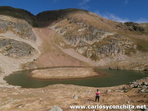 Enseguida llegamos al lago de Isla, que tiene ese nombre por la existencia de una especie de isla en el centro, a la que se puede llegar sin problemas por unas piedras que la unen a "tierra firme". Cuando llegamos al lago, realmente casi no se vé la isla, pero si lo bordeamos por nuestra derecha, veremos enseguida el paso que nos permite ir al centro. Cruzamos despues por las piedras para ir al centro, y desde allí podemos ver enfrente el punto de "desague" del lago por donde hemos llegado, y al fondo , las montañas del otro lado del valle de Incles