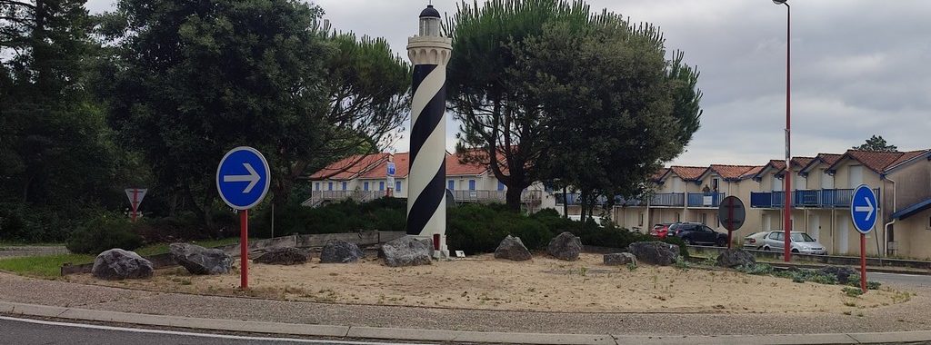 La foto de portada de esta publicación no es el verdadero faro de Contis, sino una reproducción del mismo en una rotonda.