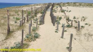 Pasamos por varios observatorios, uno en el primer lago que encontramos, en el que podemos ver bastantes nutrias, y otros en la playa, sobre las dunas, y en uno de ellos podemos ver unos carteles explicativos de los trabajos de mantenimiento que se han llevado a cabo desde el año 1802, plantando pinos marítimos en 88.000 Ha. (ver album de fotos ), que dió lugar a los bosques de las Landas.