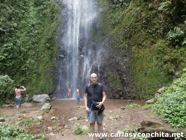 Finalmente, llegamos a la cascada, completamente sudados y algo cansados por la alta temperatura y sobretodo por la gran humedad. Y aunque no llevamos bañador, intentamos refrescarnos algo con la helada agua que cae por la cascada.